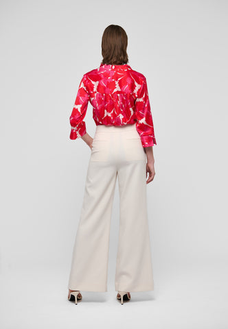 Die minimalistischen Details dieser raffinierten Seidenbluse in regulärer Passform lassen den auffälligen, grafischen Blumenprint in Rot- und Rosatönen voll zur Geltung kommen. Ein Stehkragen geht in eine schlichte, überlappende Knopfleiste über, während die 3/4-Ärmel mit breiten Manschetten im Kimono-Stil abschließen.
