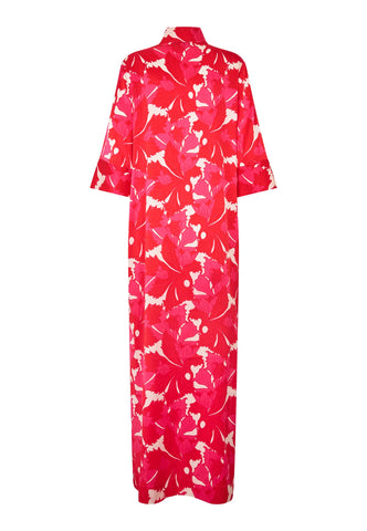 Ein beliebter Dea-Kudibal-Klassiker: Helga ist ein bodenlanges Kleid in entspannter Passform mit kimonoartigem Ausschnitt, Stehkragen und weiten 3/4-Ärmeln. Diese Seidenvariante kommt mit einem ausdrucksstarken Print vergrößerter Blätter in Rot- und Rosatönen.