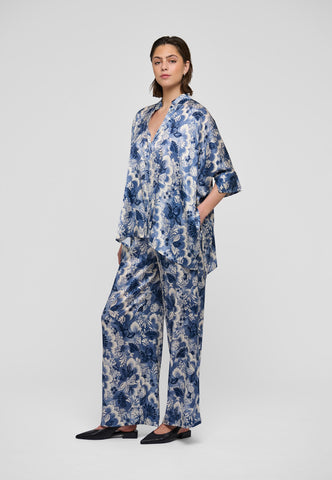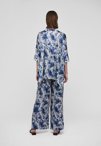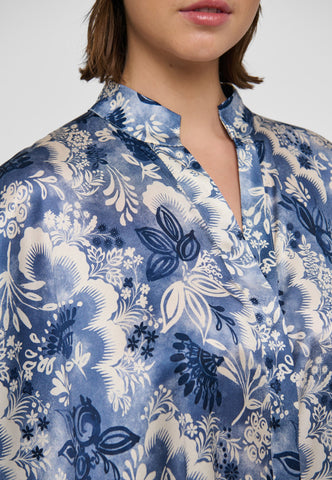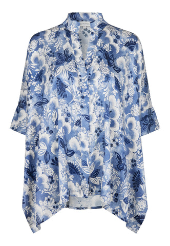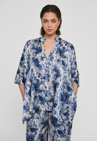 Oversized und unkompliziert zu tragen: Diese sehr weit geschnittene Seidenbluse mit einem wunderschönen Print blauer Blumen hat 3/4-lange Ärmel, eine verdeckte Knopfleiste und einen kleinen Stehkragen. Tragen Sie sie mit Jeans für einen lässigen Tageslook – oder kombinieren Sie sie abends mit einem Rock für einen eleganteren Auftritt.
