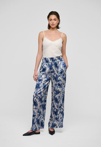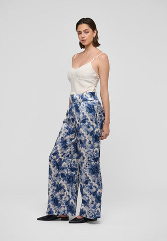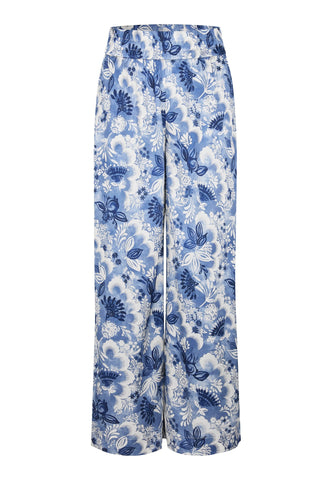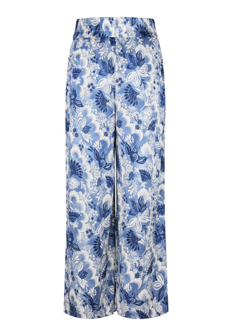 Weit geschnittene Seidenhosen sind ein klassischer Sommerstyle – und dieses Modell mit einem raffinierten blauen Blumenprint und breitem elastischem Bund ist ein stilvolles Beispiel. Tragen Sie sie mit einem schlichten Top oder einem Strickteil für ein mühelos elegantes Outfit.
