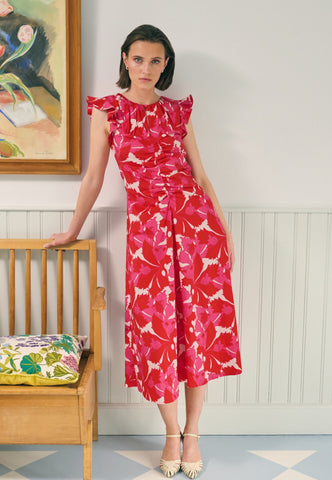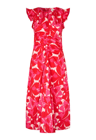 Große Volants an den Schultern verleihen diesem schönen Kleid aus Baumwollpopeline eine markante Silhouette. Sie gehen in ein figurbetontes Oberteil mit Raffungen am Halsausschnitt über, dazu kommt ein Rock, der bis zur Wadenmitte fällt. Raffungen sorgen auch vorne für Formgebung, und ein Schlüssellochausschnitt mit einem einzelnen Knopf ist ein elegantes Detail. Der ausdrucksstarke Print aus roten und rosafarbenen Blättern bringt zusätzlich Drama ins Spiel.
