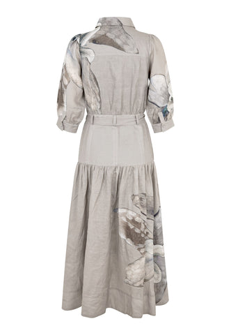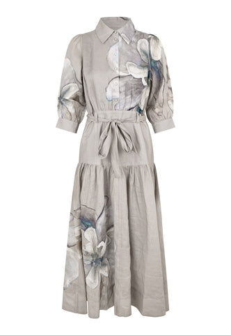 Wunderschöne, oversized gemalte Blumen in natürlichen Farbtönen sind über dieses bodenlange Kleid aus bedrucktem Leinen verteilt. Ein figurbetontes Oberteil mit sauberem Hemdkragen und halber Knopfleiste sowie 3/4-langen Ärmeln geht unterhalb der Taille in einen weiter schwingenden Rock über, wobei ein Bindegürtel aus Oberstoff die Taille betont. Geschlossen wird das Kleid mit einem seitlichen Reißverschluss.