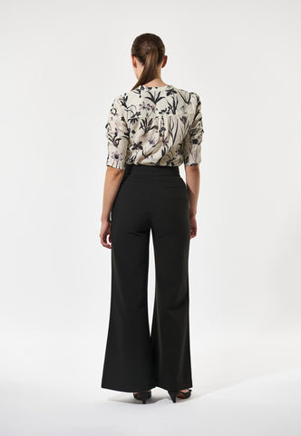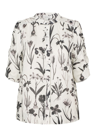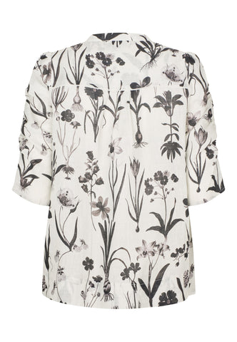 Mit verstreuten schwarzen botanischen Zeichnungen versehen, hat dieses Leinenhemd in normaler Passform eine unkomplizierte, sommerliche Ausstrahlung. Ein Stehkragen hält das Design schlicht, während die halblangen Ärmel an der Außenkante gerafft sind. Weiße Paspeln an den Schultern und entlang der Knopfleiste sowie zarte, stoffbezogene Knöpfe setzen raffinierte Akzente.