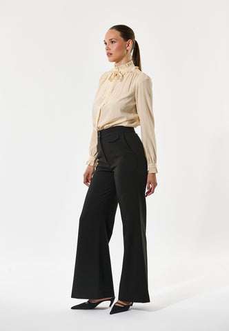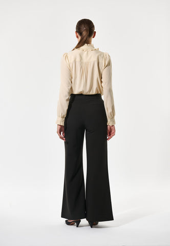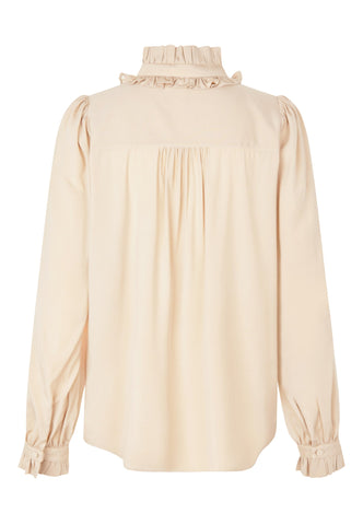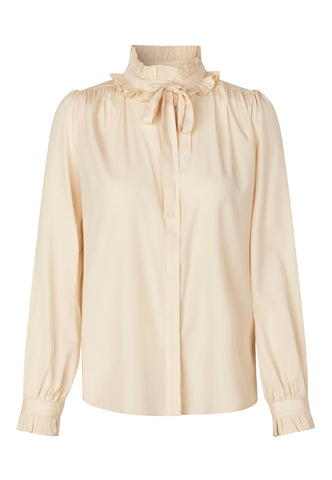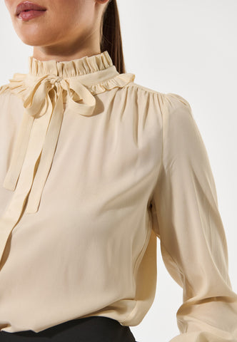 Zwei Reihen Volants, die mit einer Schleife aus Oberstoff zusammengebunden werden, bilden einen dramatischen Kragen an dieser eleganten und raffinierten Bluse aus cremefarbener Seide. Weite Ärmel unterstreichen die Silhouette, und zarte Rüschen bilden den Abschluss an den Manschetten.