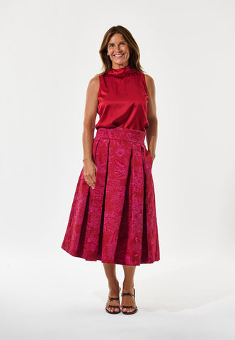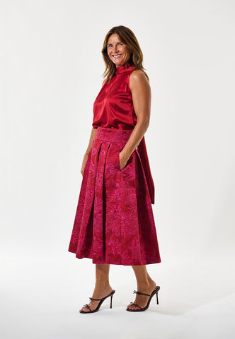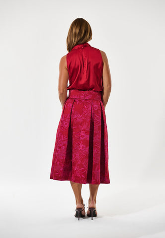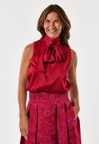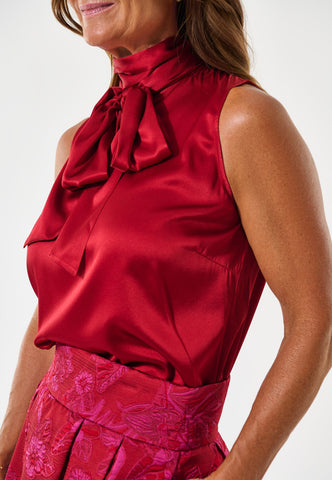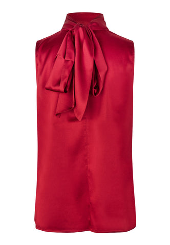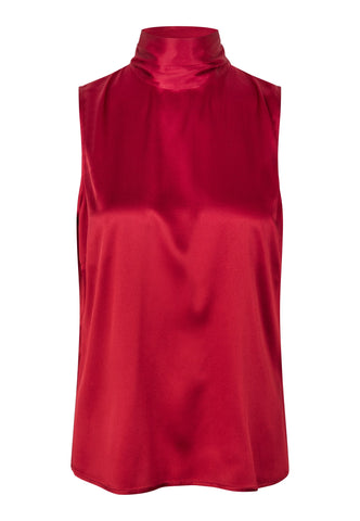 Dieses elegante, ärmellose Oberteil aus leuchtend rotem Seidentwill besticht durch seinen hohen Schalkragen, der vielseitig getragen werden kann – entweder als lockere Schleife im Rücken oder dekorativ nach vorn gebunden. So eröffnen sich verschiedene Styling-Möglichkeiten. Die locker umspielende Passform unterstreicht das Design.