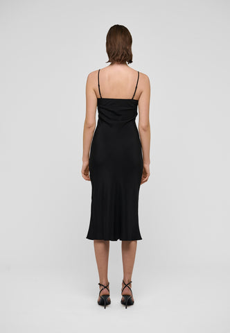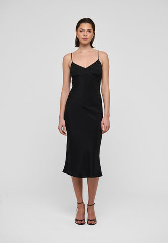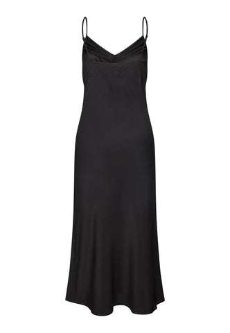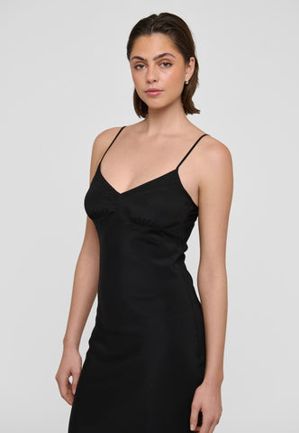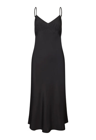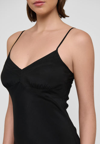 Ein Slipdress aus schwarzer Seide ist eine chice und sinnliche Option für den Abend – getragen unter einer Jacke oder einem weichen Cardigan. Diese stilvolle Variante hat mehrere aufwendig gearbeitete Einsätze und feine Abnäher an der Brust, die für eine perfekte Passform sorgen. Es hängt an zwei verstellbaren Spaghettiträgern, und der Schrägschnitt sorgt dafür, dass es den Körper sanft umspielt und weich bis zur Wadenmitte fällt.