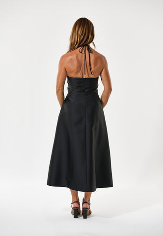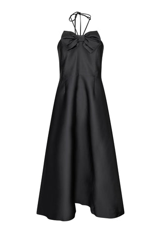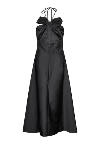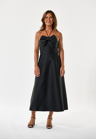 Dieses schwarze Taftkleid ist das perfekte Outfit für eine Cocktailparty. Das figurbetonte Oberteil geht in einen Rock über, der bis zur Mitte der Wade reicht. Das Bustier ist mit einer großen dekorativen Schleife verziert, und die schmalen Bänder lassen sich auch im Nacken binden. Hinten ist das Kleid tief ausgeschnitten und wird mit einem verdeckten Reißverschluss geschlossen.