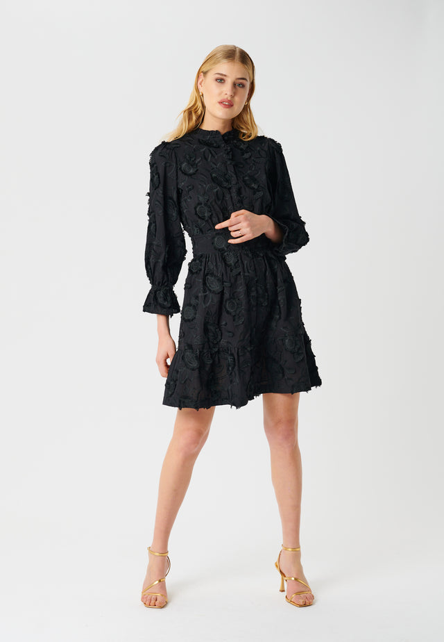 Dieses atemberaubende Kleid, das komplett mit dreidimensionalen Stickereien bedeckt ist, ist perfekt für den Abend. Die geraffte Taille, die voluminösen Ärmel und die gerüschten Manschetten verleihen dem Kleid einen zusätzlichen Glamourfaktor. Das Kleid ist aus 70% Baumwolle und 30% Polyester gefertigt.