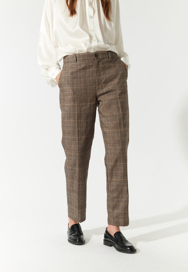 Ein einfaches Paar Slim-Fit-Zigarettenhosen ist immer eine elegante Option für die Garderobe. Dieses Modell aus Leinen-Baumwoll-Karo ist bis zum Knöchel gekürzt und verfügt über Seiten- und Gesäßtaschen mit einem Knopf. Sie können allein mit einem Hemd oder Pullover getragen oder mit dem Alberta-Blazer kombiniert werden, um einen stilvollen Sommeranzug zu kreieren.