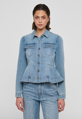 Diese Denimjacke verbindet Utility-Details mit unverkennbarer Femininität: Sie hat Western-Taschen, typische Jeansjacken-Nähte und Metallknöpfe, dazu jedoch eine taillierte Passform, die über der Hüfte leicht ausgestellt verläuft. Ein kleines Logo ist mittig hinten am Nacken aufgestickt.
