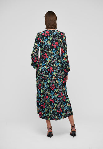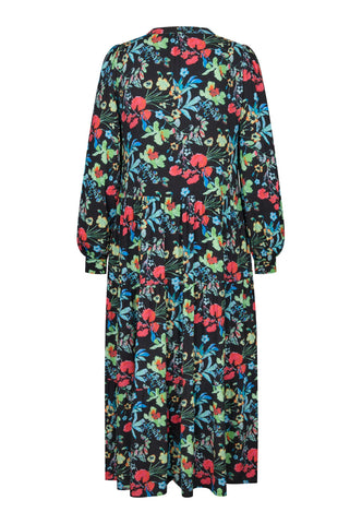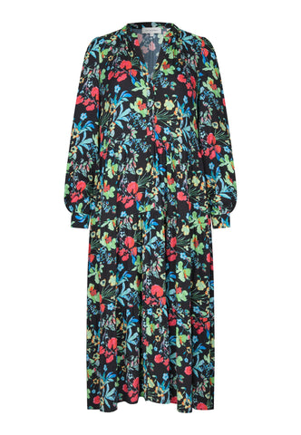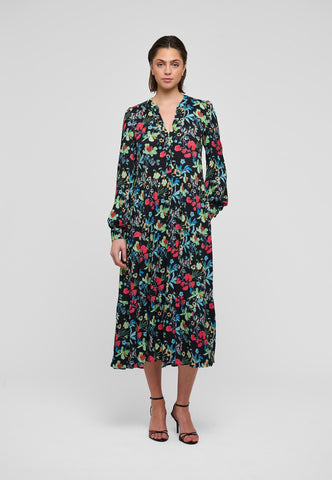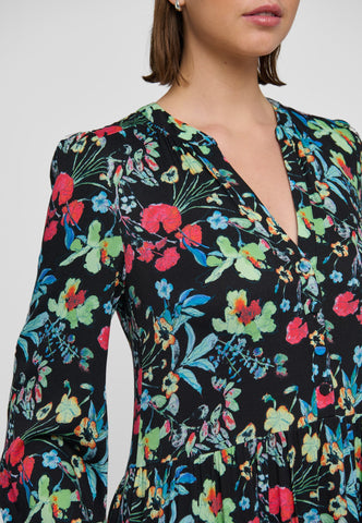 Mit einem Rock aus mehreren Stufenvolants ist dieses Kleid aus Viskosecrêpe mit einem wunderschönen Print mehrfarbiger Blumen zugleich feminin und unkompliziert zu tragen. Der Stehkragen geht in einen V-Ausschnitt mit Knöpfen über, und die weiten Ärmel enden in schlichten Manschetten.