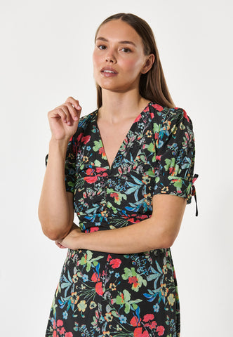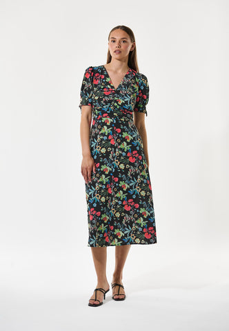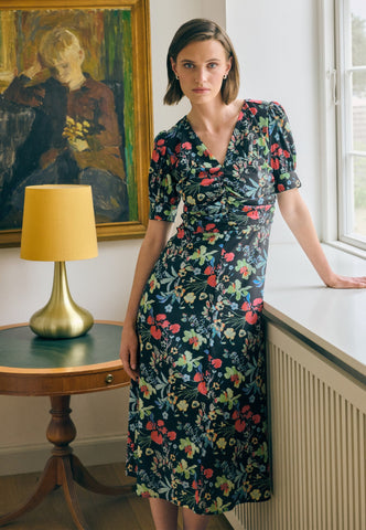 Kleine Falten in der Taille formen eine elegante, figurbetonte Silhouette bei diesem Seidenkleid mit V-Ausschnitt, das bis zur Mitte der Waden fällt. Der fröhliche Blumendruck auf schwarzem Hintergrund verleiht dem Kleid eine besonders feminine Ausstrahlung, ebenso wie die kurzen, voluminösen Ärmel, die mit Bindebändern aus demselben Stoff geschlossen werden.