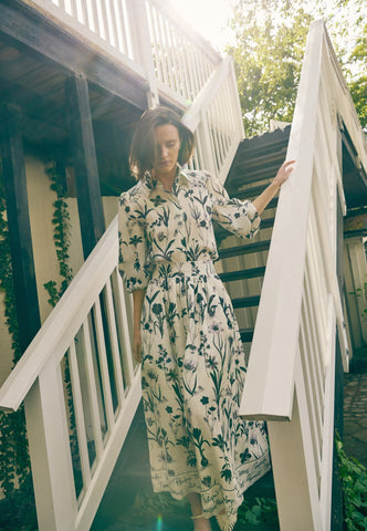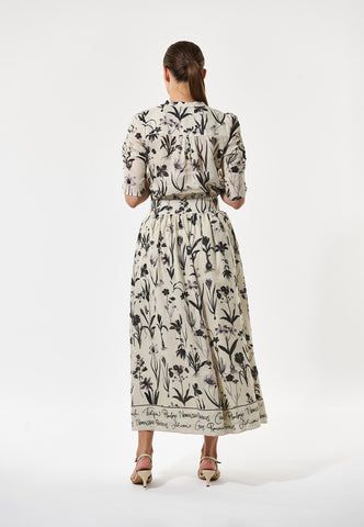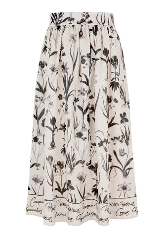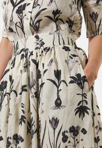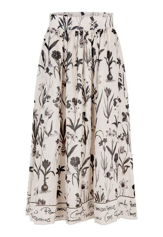 Feminin und entspannt für einen Sommertag: Dieser stilvolle Leinenrock mit einem auffälligen Print botanischer Zeichnungen fällt von einem breiten, hohen Bund in eine weit ausgestellte Form und endet auf Wadenmitte. Eine Bordüre aus handschriftlicher Schrift setzt ein interessantes Detail. Er ist vollständig gefüttert, und seitliche Taschen verleihen ihm eine lässige Note.