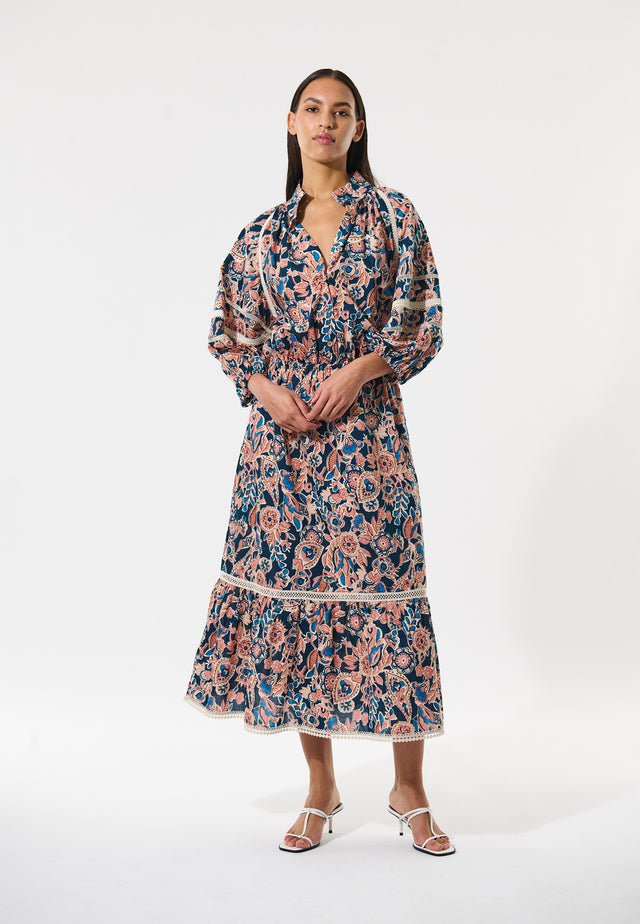 Möglicherweise die perfekte Wahl für den Sommer: Dieses bodenlange, regulär geschnittene Kleid aus bedrucktem Baumwoll-Voile ist leicht, locker und völlig feminin. Zarte Spitzenbänder schmücken den gestuften Rock und die voluminösen Ärmel, während der Stehkragen und die Knopfleiste auf der Vorderseite seinen Charme unterstreichen.