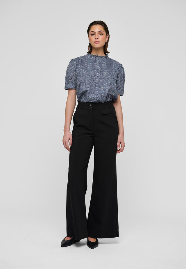 Feine Fältchen verlaufen quer über die Vorderseite dieser bezaubernden, hübschen Bluse mit kurzen Ärmeln. Ein gerüschter Stehkragen unterstreicht den Charme – ebenso wie der Print kleiner blauer Blumen auf weichem Baumwollvoile.