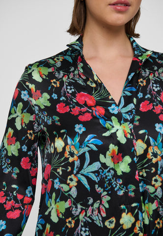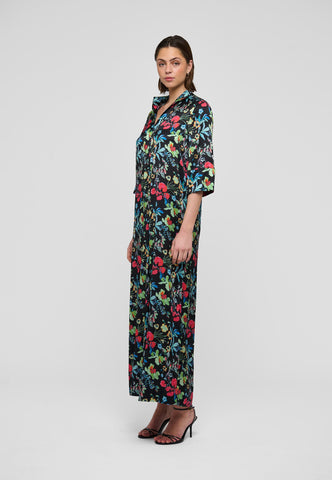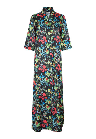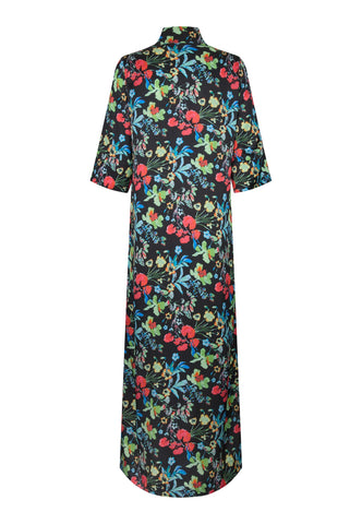 Ein ewig beliebter Dea-Kudibal-Klassiker: Helga ist ein bodenlanges Kleid in entspannter Passform mit kimonoartigem Ausschnitt, Stehkragen und weiten 3/4-Ärmeln. Diese Seidenvariante zeigt einen Print aus mehrfarbigen Blumen, die über einen dunklen Hintergrund verstreut sind.