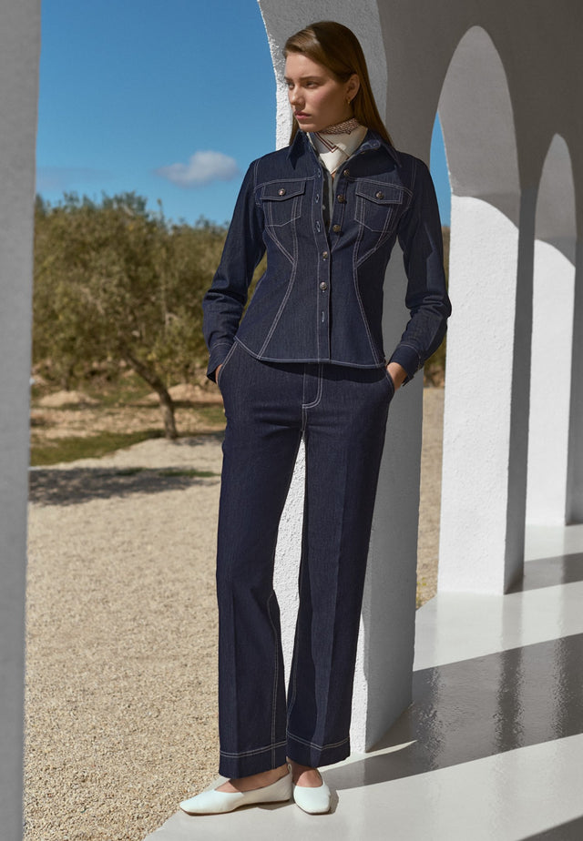 Kontrastnähte setzen weibliche Kurven bei diesem taillierten Jeanshemd gekonnt in Szene. Doppelnähte, Pattentaschen und Metallknöpfe mit Logo verleihen ihm eine moderne Interpretation des klassischen Western-Looks.