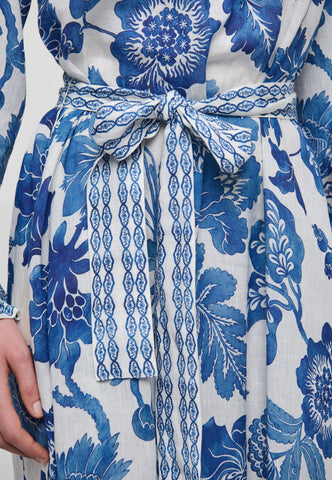Großformatige, exotische blaue Blumen zieren dieses wunderschöne Maxikleid aus Leinen und verleihen ihm eine ausgesprochen feminine und besondere Ausstrahlung. Feine Rüschen umrahmen den Kragen, während ein Bindegürtel das locker geschnittene Kleid in der Taille betont. Kontrastierende Bordüren am Saum und an den Manschetten sowie kleine, stoffbezogene Knöpfe setzen stilvolle Akzente. Das Kleid ist mit einem Unterkleid ausgestattet.