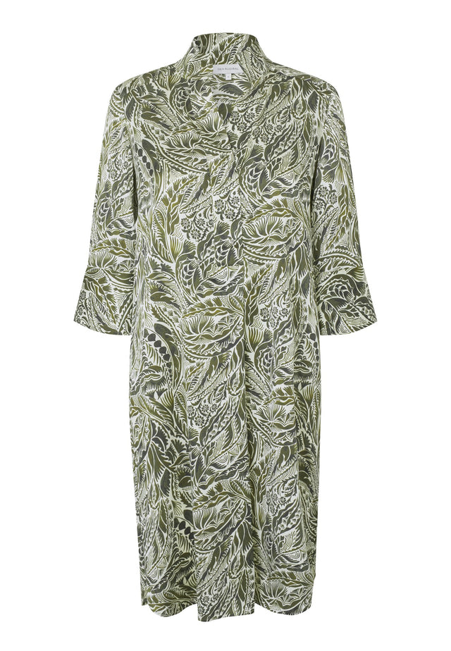 Zweifellos einer der beliebtesten Stile von Dea Kudibal. Dieses legere Midikleid ist perfekt für den Sommer. Der Kimono-Ausschnitt und der Kragen verleihen ihm eine raffinierte Eleganz, während die tiefen Ärmel eine entspannte Leichtigkeit vermitteln. Diese elegante Version präsentiert sich mit einem Blätterprint auf Viskose-Crêpe.