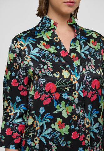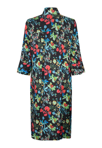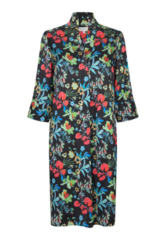 Eines der beliebtesten und zeitlosesten Modelle von Dea Kudibal: Dieses locker geschnittene Midikleid mit Wadenlänge schmeichelt jeder Figur. Der Kimono-Ausschnitt mit Kragen verleiht dem Kleid eine elegante Note, während die tiefen Ärmel mit stoffbezogenen Knöpfen eine lässige Ausstrahlung haben. Diese ausdrucksstarke Variante aus schwarzer Seide wird durch kräftig bedruckte Blumen über das gesamte Kleid hinweg zum Blickfang.