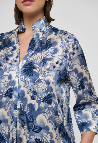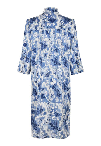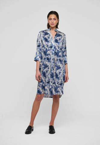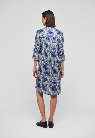 Eines der beliebtesten und zeitlosen Modelle von Dea Kudibal: Dieses locker geschnittene Midikleid in Wadenlänge schmeichelt jeder Figur. Der Kimono-Ausschnitt mit Kragen verleiht dem Kleid eine elegante Note, während die tiefen Ärmel mit stoffbezogenen Knöpfen eine entspannte Ausstrahlung haben. Diese stilvolle Variante ist aus Seide gefertigt und mit blauen, exotischen Blumenmotiven bedruckt.
