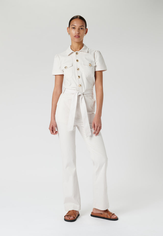 Dieser stilvolle, weiße Jumpsuit erinnert an den sportlichen Chic der 70er Jahre und hat einen Vintage-Look, der perfekt zur Frau von heute passt. Kurzärmlig, mit Messingknöpfen und einer Taille zum Binden, hat er eine schmale Passform mit geraden Beinen. Der Jumpsuit besteht aus 97 % Baumwolle und 3 % Elasthan- Vintage-Stretch-Twill.