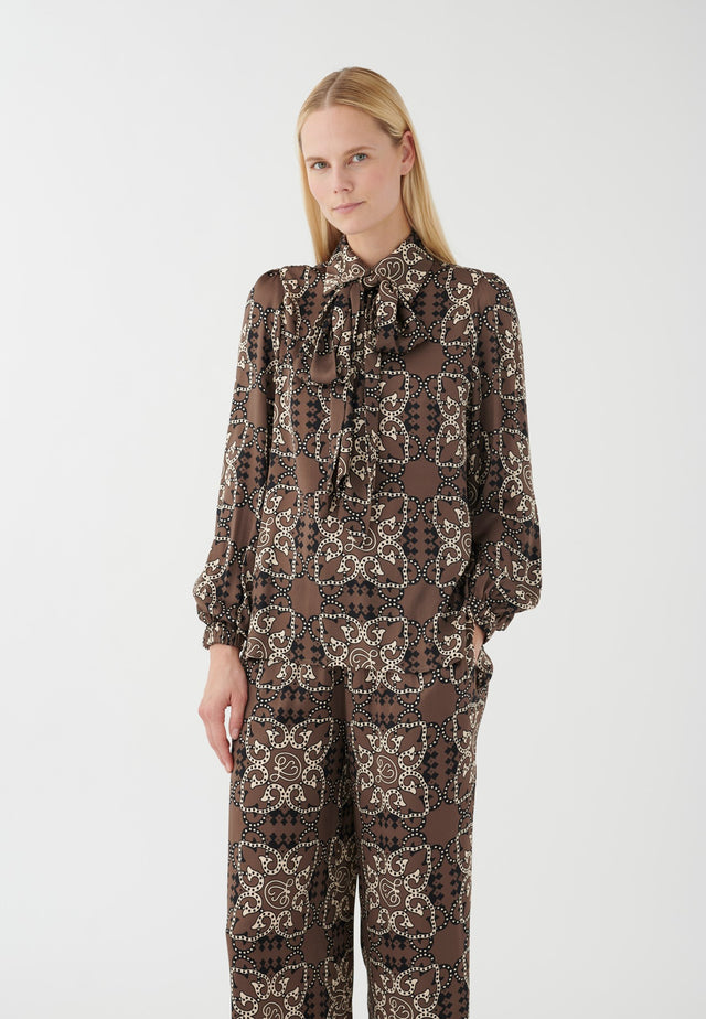 Überdimensionale geometrische Formen auf einem braunen Hintergrund bilden das Muster für diese auffällige Seidenbluse. Der Schal am Kragen kann zu einer Schleife gebunden oder in einem lässigeren Stil locker gelassen werden.