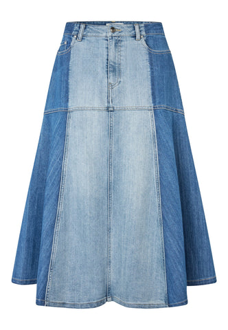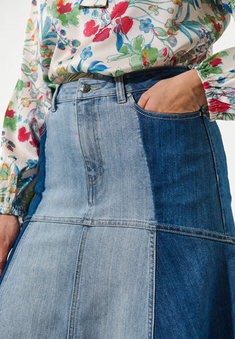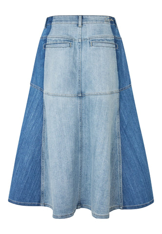 Durch die clevere Kombination von dunklem und gewaschenem Denim ist dieser Rock an der Hüfte figurbetont und schwingt dann aus, um auf Wadenmitte zu enden. Jeans-Taschen, Gürtelschlaufen und Metallnieten verleihen ihm einen urbanen Workwear-Vibe, und er sieht sowohl mit einem Hemd als auch mit einem schlichten Strickteil großartig aus.