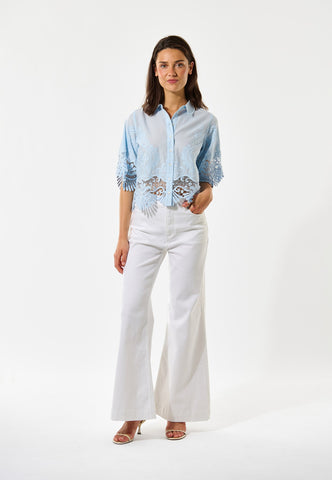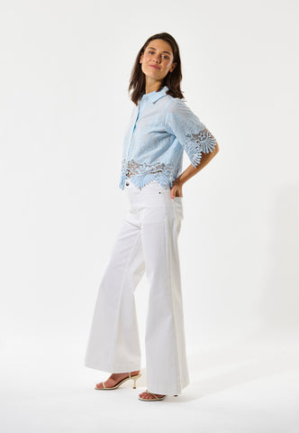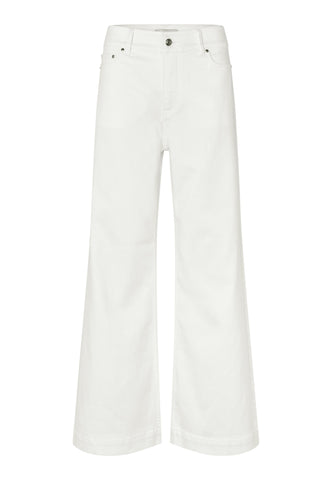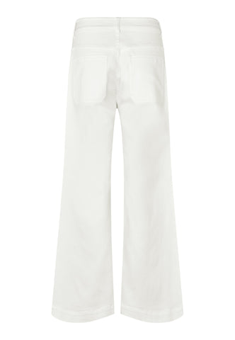 Diese weißen Denim-Hosen sitzen eng über der Hüfte und hoch in der Taille und werden zum Saum hin ausgestellt. Ein stilvolles, vielseitiges Wardrobe-Piece. Western-inspirierte Vorder- und Gesäßtaschen verleihen eine urbane Attitüde. Die Hose kann solo getragen oder mit der Blanca-Jacke kombiniert werden.