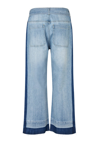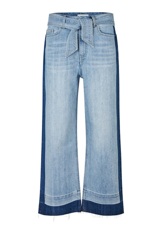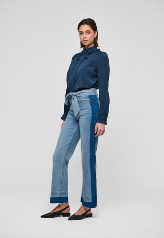 Zwei verschiedene Denimfarben und -waschungen werden kombiniert, um eine markante Hose mit geradem Bein zu kreieren. Dunklere Stoffeinsätze verlaufen seitlich und entlang des Saums und verleihen ihr Tiefe und Struktur. Leicht verkürzt bis zum Knöchel geschnitten, mit klassischen Jeans-Taschen vorne und hinten, wird die Hose in der Taille mit einem Gürtel aus dem gleichen Stoff betont.