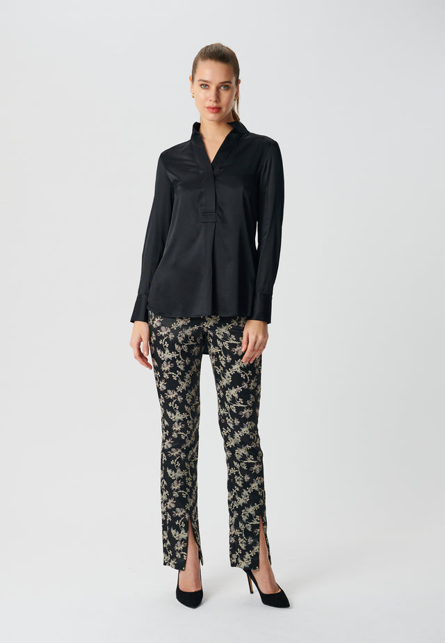 Der minimalistische Stil dieser Bluse mit tiefem V-Ausschnitt und Stehkragen ist die perfekte Ergänzung zu dem winzigen grafischen Blumendruck in Rosa und Blau. Die Bluse besteht aus 90 % Stretch Seide Twill und 10 % Elasthan.