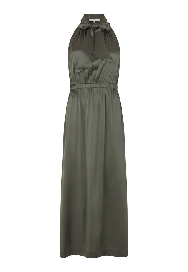 Raffinierte und feminine Neckholder-Kleider verleihen Abendveranstaltungen immer eine Portion echten Glamour. Diese bodenlange Variante hat einen Schalkragen, der auf viele verschiedene Arten gebunden werden kann, und tiefe Seitenschlitze. Der Seidensatinstoff ist in einem tiefen Khakiton gehalten.