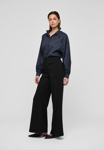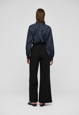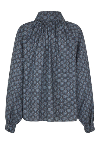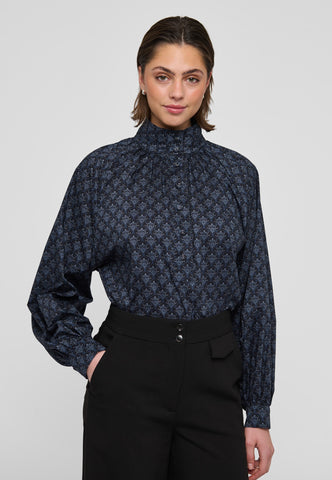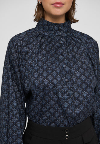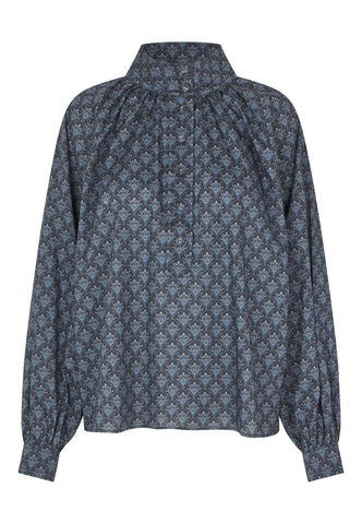 Zarte Fältchen raffen den Körper dieser locker geschnittenen Bluse mit Raglanärmeln in einen hoch angesetzten, mehrfach abgesteppten Stehkragen. Der mit einem kleinen grafischen Muster bedruckte Baumwollvoile und die stoffbezogenen Knöpfe verleihen ihr eine raffinierte Ausstrahlung.