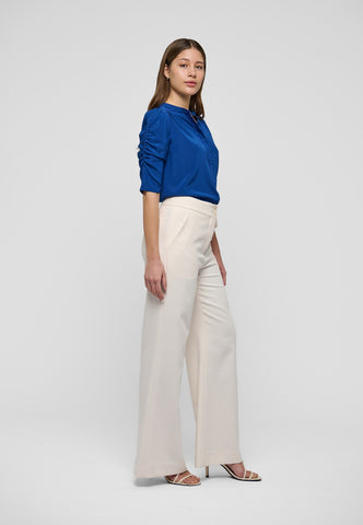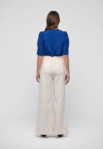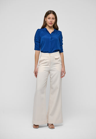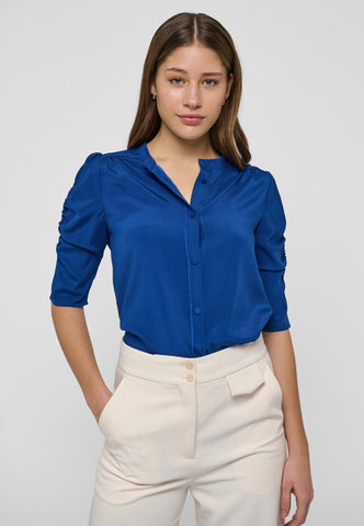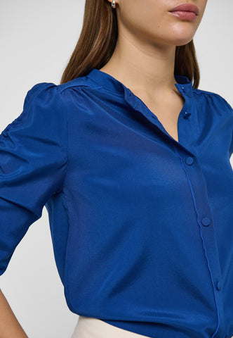 Aus tiefblauer Seide gefertigt, hat dieses Hemd in normaler Passform eine unkomplizierte und zugleich raffinierte Ausstrahlung. Ein Stehkragen hält das Design schlicht, während die halblangen Ärmel an der Außenkante gerafft sind. Hellblaue Paspeln an den Schultern und entlang der Knopfleiste sowie zarte, stoffbezogene Knöpfe sind elegante finishing touches.