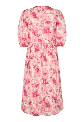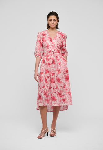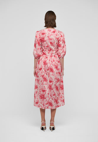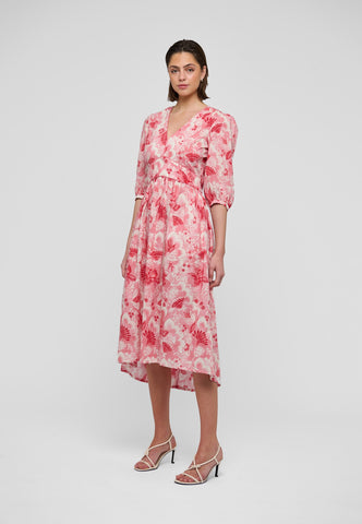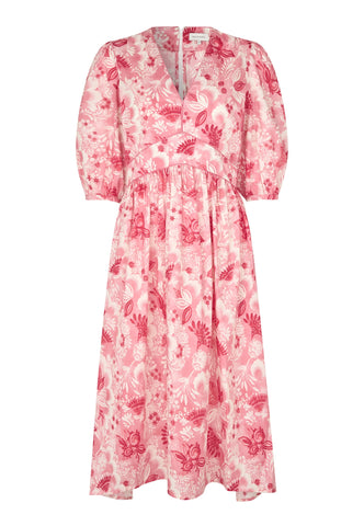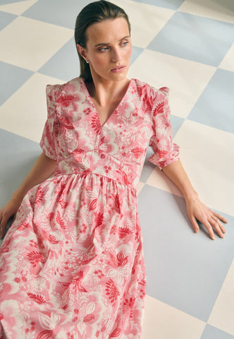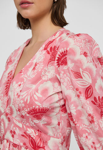 Ein taillierter Formeinsatz an der Taille, betont durch Kontrastpaspeln, akzentuiert die Figur bei diesem schönen Kleid aus Baumwollvoile mit V-Ausschnitt, bedruckt mit exotischen Blumen in Pink und Rot. Weite, ellenbogenlange Ärmel unterstreichen die feminine Silhouette, ebenso wie der ausgestellte Rock, der bis zur Wadenmitte fällt.