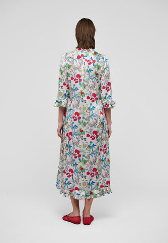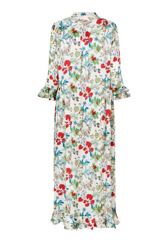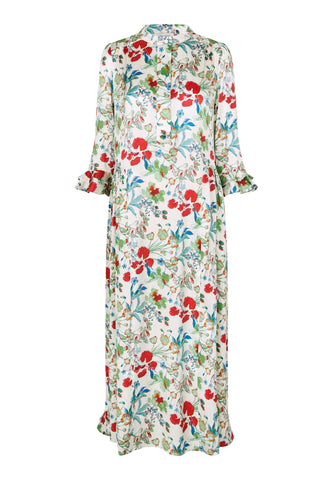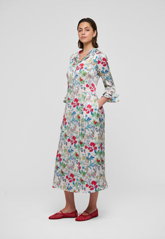 Ein ausdrucksstarker Print aus mehrfarbigen Blumen auf Seidentwill verleiht diesem knöchellangen Kleid mit 3/4-Ärmeln eine starke Wirkung – es ist zugleich auffällig und sehr elegant. An den Manschetten und am hinteren Saum befinden sich doppelte Volants, zudem sind die Ärmel leicht gerafft.