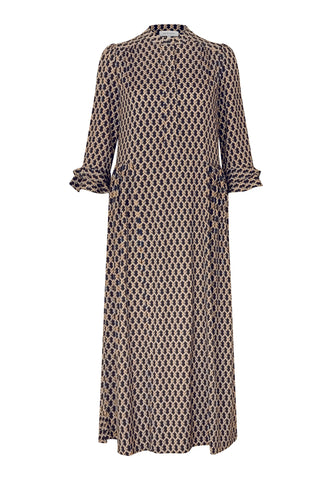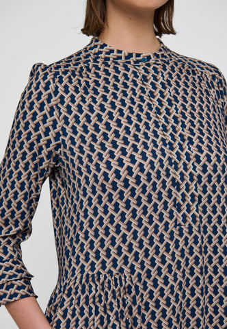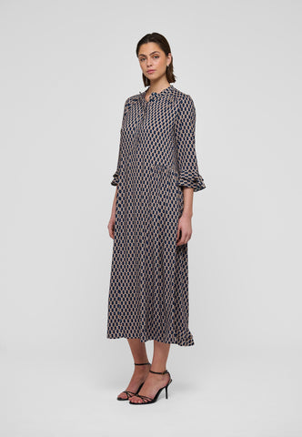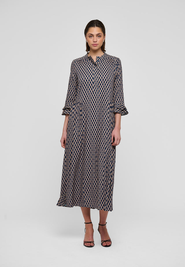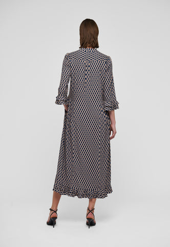 Ein kleiner grafischer Print auf Viskosecrêpe verleiht diesem knöchellangen Kleid mit 3/4-Ärmeln eine raffinierte Ausstrahlung – es ist sowohl klassisch als auch sehr chic. An den Manschetten und am hinteren Saum befinden sich doppelte Volants, zudem sind die Ärmel leicht gerafft.
