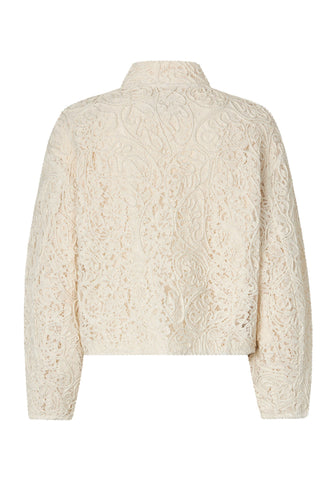 Zurückhaltende Details lassen den exquisiten cremefarbenen Spitzenstoff dieser Jacke besonders gut zur Geltung kommen. Mit Druckknöpfen und Hosenschlitz vorne, Stehkragen und skulpturalen Ärmeln – kurz und tailliert geschnitten. Kombinieren Sie sie für ein glamouröses Outfit mit dem passenden Alma-Rock.
