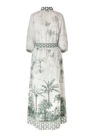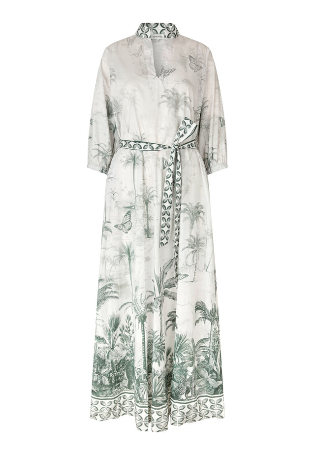 Große, malerische Pfingstrosen bilden einen Placement-Print auf diesem wunderschönen langen Kleid aus feinem Leinen. Luftig und kühl, in regulärer Passform, die mit einem Gürtel aus Oberstoff in der Taille gebunden wird; der kleine Stehkragen wirkt chic und elegant.