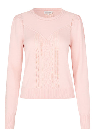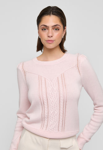 Zarte Zopf- und Lochmuster verlaufen mittig am Vorderteil und entlang der Ärmel dieses Rundhalspullovers, während eine Naht die Brustlinie betont. In zartem Rosa aus einer Baumwoll-/Wollmischung gestrickt, hat der Pullover zusätzliches Lochmuster und leichte Raffungen an den Schultern.