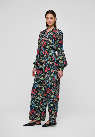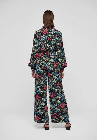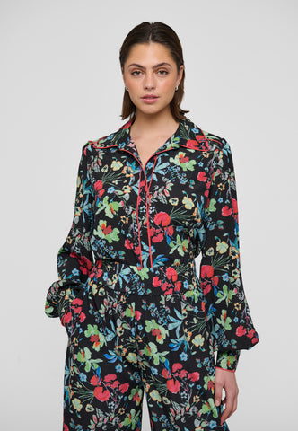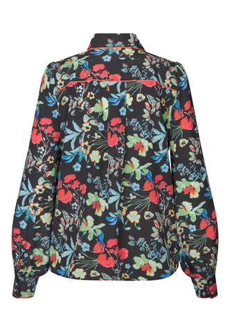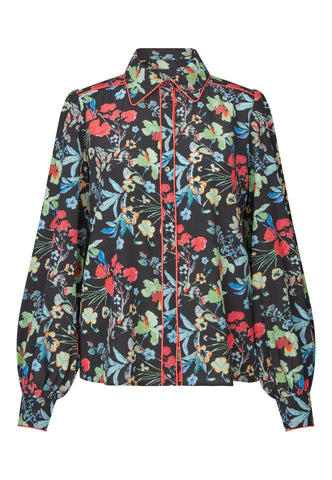 Auffällige rote Paspeln verlaufen entlang des Kragens, über die Schultern und vorn entlang dieser Seidenbluse mit Blumenprint und verleihen dem klassischen Design eine moderne, grafische Note. Die Bluse hat eine normale Passform mit langen Ärmeln und einer verdeckten Knopfleiste.