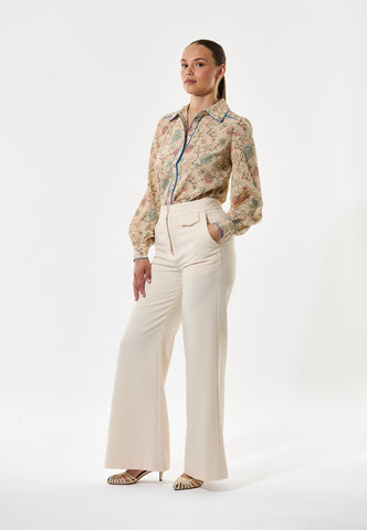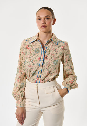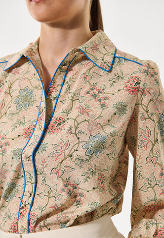 Leuchtend blaue Paspeln verlaufen entlang des Kragens, über die Schultern und vorn an dieser Seidenbluse mit Blumenprint und verleihen dem klassischen Design eine moderne, grafische Note. Die Bluse hat eine reguläre Passform mit langen Ärmeln und einer verdeckten Knopfleiste.