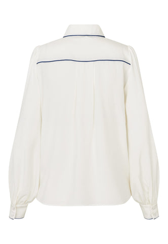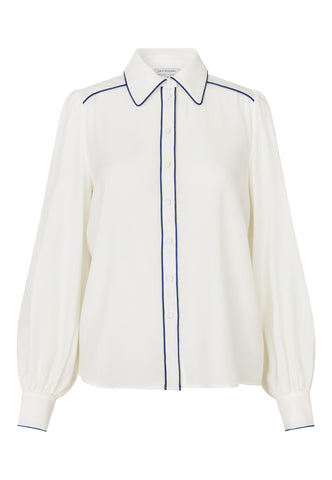 Feine schwarze Paspeln verlaufen entlang des Kragens, über die Schultern und vorn an dieser eleganten Seidenbluse in Offwhite und verleihen dem klassischen Design eine moderne, grafische Note. Die Bluse hat eine reguläre Passform mit langen Ärmeln und einer verdeckten Knopfleiste.