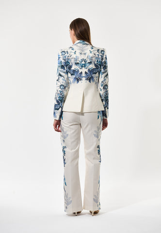 Girlanden aus blauen Blumen ranken sich über Schultern und Ärmel dieses figurbetonten Blazers aus einer Baumwoll-Seide-Mischung und verleihen dem Tailoring eine wirklich einzigartige Note. Mit zwei schrägen Pattentaschen endet die Jacke auf Hüfthöhe und wird mit zwei stoffbezogenen Knöpfen geschlossen. Tragen Sie sie als Statement-Piece solo oder kombinieren Sie sie mit der passenden Rihanna-Hose zu einem dramatischen Anzug.